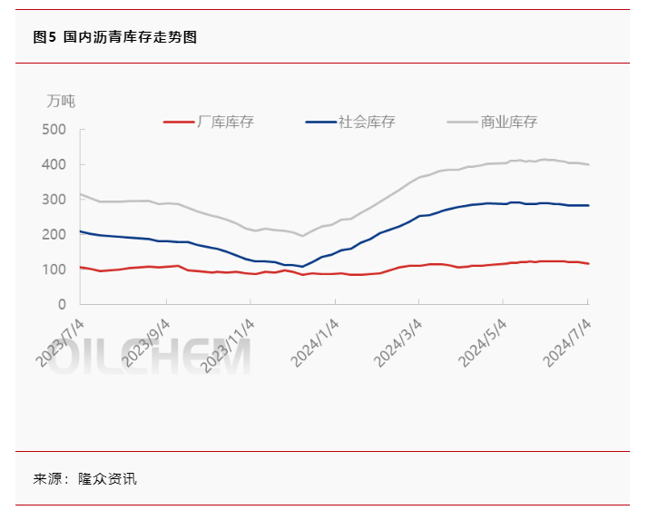 库存方面,截止2024年7月4日,国内54家沥青样本厂库库存共计116.4万吨,较上周四(6月27日)减少4.4%。本期国内沥青厂库库存去库明显,其中华东地区厂库去库较多,主要由于区内部分炼厂转产,整体供应下降,加之船发移库带动下,厂库库存去库明显。截止2024年7月4日,国内沥青104家社会库库存共计284万吨,较上周四(6月27日)增加0.4%。统计周期内国内社会库存小幅累库,国内多数地区出现累库情况,其中华中地区累库较为明显,主要由于炼厂发船货集中入库,少量厂库资源移至社会库,带动社会库累库。整体而言,商业库存出现去库,供需关系得到缓解,利好沥青业者心态。